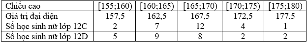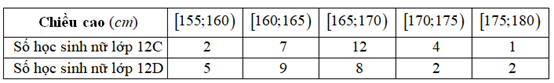 Bạn Trang thống kê chiều cao (đơn vị: cm) của các bạn học sinh nữ lớp 12C và lớp 12D ở bảng sau: