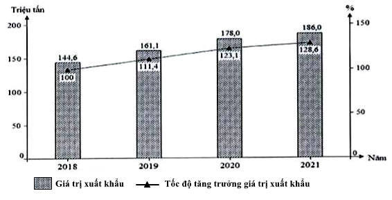 Cho biểu đồ về hàng xuất khẩu qua các cảng của nước ta giai đoạn 2018-2021 Nhận xét nào sau
