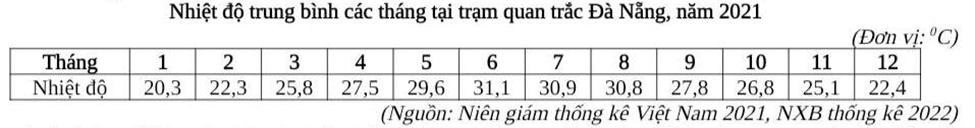 Căn cứ vào bảng số liệu trên, hãy cho biết nhiệt độ không khí trung bình năm 2021 tại trạm quan trắc Đà Nẵng là bao nhiêu °C (làm tròn kết quả đến một chữ số thập phân).