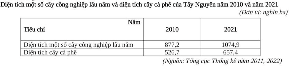 Căn cứ vào bảng số liệu trên, hãy cho biết tỉ trọng diện tích cây cà phê trong tổng diện tích một số cây công nghiệp lâu năm của Tây Nguyên năm 2021 so với năm 2010 tăng thêm bao nhiêu phần trăm (làm tròn kết quả đến một chữ số thập phân).