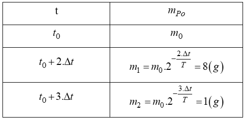 Pôlôni \({}_{84}^{210}Po\) là chất phóng xạ \(\alpha \). Ban đầu có một mẫu \({}_{84}^{210}Po\) nguyên chất. Khối lượng trong mẫu \({}_{84}^{210}Po\) ở các thời điểm \(t = {t_0},t = {t_0} + 2.\Delta t\) và \(t = {t_0} + 3.\Delta t\,\,\left( {\Delta t > 0} \right)\) có giá trị lần lượt là \({m_0};8g\)và 1 g. Giá trị của \({m_0}\) là
