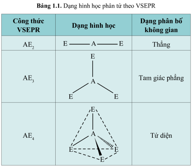 Vị trí phân bố các đám mây electron E xung quanh nguyên tử trung tâm A theo số lượng đám mây khác nhau được cho trong Bảng 1.1.