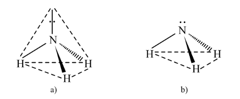 Trong phân tử ammonia (NH3), nguyên tử trung tâm N có 3 liên kết đơn xung quanh và 1 cặp electron hóa trị riêng chưa tham gia liên kết, nên công thức VSEPR của NH3 là AE3 và phân tử này có dạng hình học tam giác phẳng.