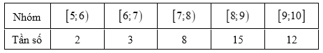 Lớp \(12A\) có 40 học sinh, trong đó có 8 em tham gia Câu lạc bộ Toán học. Điểm thi học kỳ 1 môn Toán của cả lớp được thống kê trong bảng sau:
