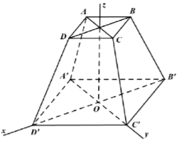 Cho khối chóp cụt tứ giác đều \(ABCD \cdot {A^\prime }{B^\prime }{C^\prime }{D^\prime }\) có chiều cao bằng 3 cm , diện tích hai đáy lần lượt bằng \(72\;{\rm{c}}{{\rm{m}}^2}\) và \(18\;{\rm{c}}{{\rm{m}}^2}\). Gọi I, O tương ứng là tâm của hai đáy ABCD và \({A^\prime }{B^\prime }{C^\prime }{D^\prime }\). Chọn hệ trục toạ độ Oxyz, với đơn vị trên mỗi trục là cm sao cho tia Ox cùng hướng với vecto \(\overrightarrow {O{D^\prime }} \), tia Oy cùng hướng với vecto \(\overrightarrow {O{C^\prime }} \), tia Oz cùng hướng với vectơ \(\overrightarrow {OI} \) (như hình vẽ).