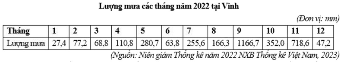 Căn cứ vào bảng số liệu trên, hãy tính tổng lượng mưa tại Vinh năm 2022 (làm tròn kết quả đến hàng đơn vị của mm).