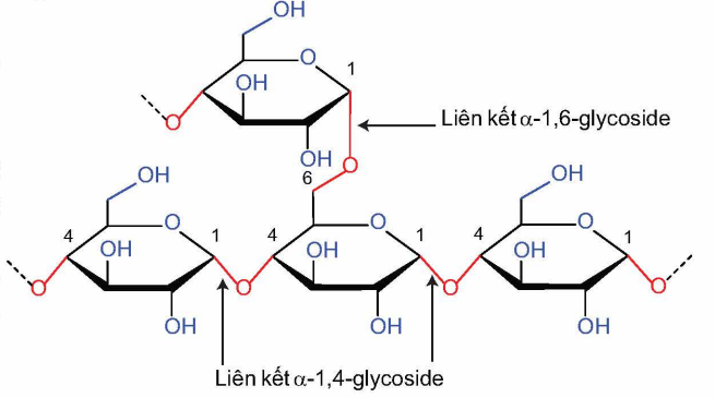 c) Amylopectin được cấu tạo từ nhiều đơn vị α-glucose liên kết với nhau qua liên kết α-1,4-glycoside và α-1,6-glycoside hình thành cấu trúc mạch phân nhánh.