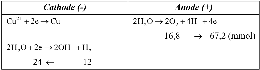 Bảo toàn electron ta có: \({\rm{2}}{{\rm{n}}_{{\rm{Cu}}}} + 2{{\rm{n}}_{{{\rm{H}}_2}}} = 4{{\rm{n}}_{{{\rm{O}}_2}}} \to {{\rm{n}}_{{\rm{Cu}}}} = \frac{{4{{\rm{n}}_{{{\rm{O}}_2}}} - 2{{\rm{n}}_{{{\rm{H}}_2}}}}}{2}\)