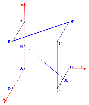 Cho hình hộp chữ nhật \(ABCD.A'B'C'D'\) có \(AB = BC = a\) và \(CC' = 2a\). Gọi \(M\) và \(N\) lần lượt là trung điểm của cạnh \(BC\) và \(AA'\). Khoảng cách giữa hai đường thẳng \(B'D'\) và \(MN\) bằng