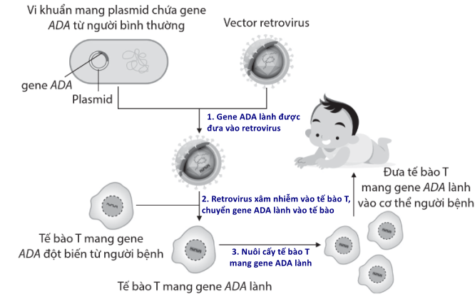 Hình 1.6 mô tả sơ đồ quá trình điều trị rối loạn suy giảm miễn dịch (SCID) nhờ liệu pháp