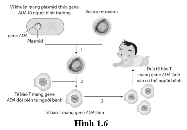 Hình 1.6 mô tả sơ đồ quá trình điều trị rối loạn suy giảm miễn dịch (SCID) nhờ liệu pháp gene. Các số 1, 2 và 3 trong hình 4.1 tương ứng là: