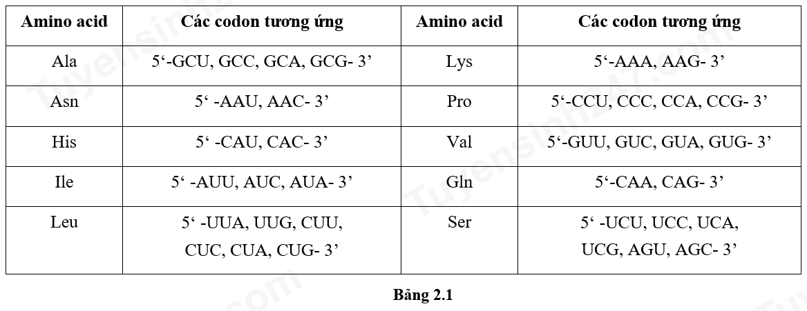 Biết gene mã hoá biến thể E2 được hình thành từ gene mã hoá biến thể E1 do xuất hiện hai đột biến điểm. Một số loại amino acid và các codon tương ứng có thể có trên phân tử mRNA thể hiện ở bảng 2.1 sau: