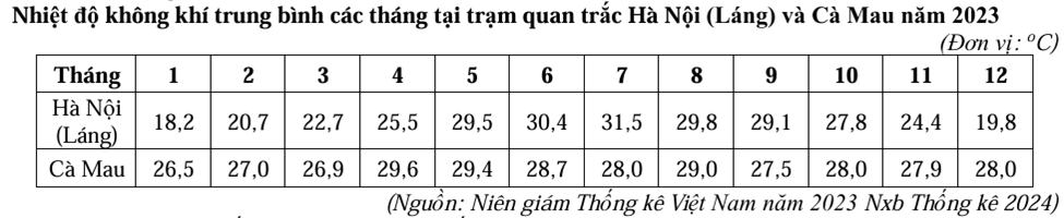 Căn cứ vào bảng số liệu trên, hãy cho biết biên độ nhiệt độ không khí trung bình năm tại trạm quan trắc Hà Nội (Láng) cao hơn biên độ nhiệt độ không khí trung bình năm tại trạm quan trắc Cà Mau là bao nhiêu °C.