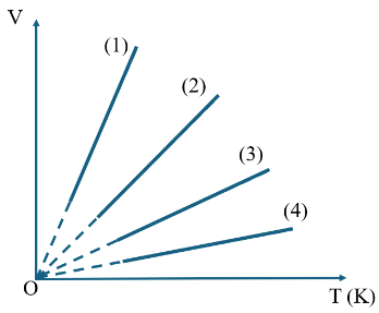 Cho bốn lượng khí khác nhau biến đổi đẳng áp ở áp suất bằng nhau thì thu được bốn đường đẳng áp có dạng như hình bên. Lượng khí có số mol nhỏ nhất ứng với đường đẳng áp nào?