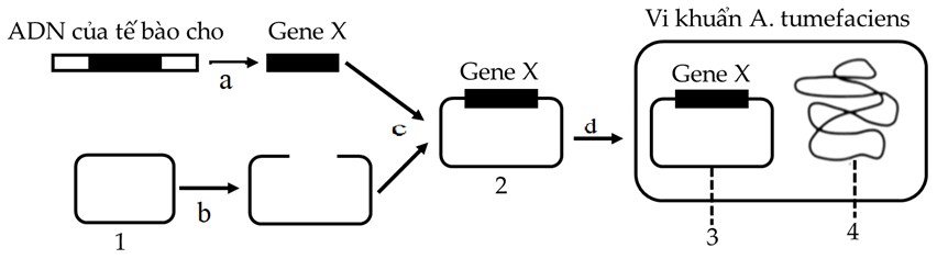 Để tạo giống lúa vàng (golden rice) giàu Beta-caroten góp phần cải thiện tình trạng thiếu vitamin A ở trẻ em, người ta cần chuyển gene X từ một loài thực vật vào cây lúa. Quy trình này sử dụng vi khuẩn Agrobacterium tumefaciens làm tế bào nhận trung gian để chuyển gene. Một trong những công đoạn rất quan trọng của quy trình này được biểu diễn trong hình dưới đây: