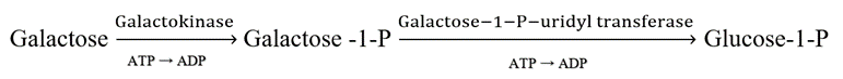 Một bé gái sơ sinh được đưa đến bệnh viện sau khi xuất hiện các triệu chứng bất thường như giảm cân nghiêm trọng, kém phát triển trí tuệ, và gan to. Qua xét nghiệm máu, bác sĩ phát hiện hàm lượng galactose-1-phosphate (Galactose -1-P) trong cơ thể bé tăng cao, gây tích lũy độc tố và ức chế các enzyme chuyển hóa khác. Bác sĩ nghi ngờ bé mắc hội chứng galactosemia - một bệnh di truyền bẩm sinh liên quan đến sự thiếu hụt enzyme galactose-1-phosphate uridyl transferase, dẫn đến rối loạn khả năng chuyển hóa galactose (hình bên dưới). Gia đình cho biết bé bú sữa mẹ từ khi sinh ra. Sau khi phân tích nguyên nhân.