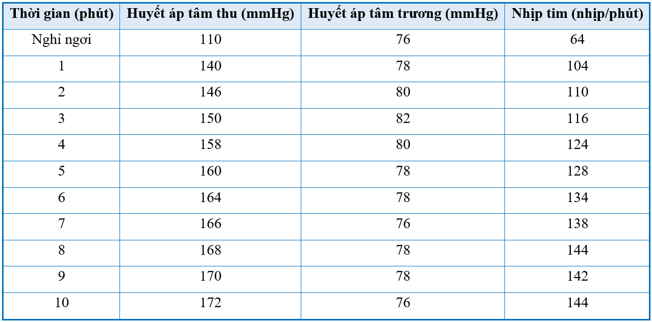 | a) Huyết áp tâm thu tăng từ mức 110 mmHg lúc nghỉ ngơi lên 172 mmHg sau 10 phút tập thể dục vì cơ thể cần ít oxy và năng lượng hơn khi bắt đầu tập thể dục. | ||