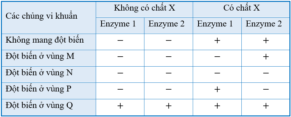 Biết rằng, gene điều hòa điều khiển hoạt động operon X tổng hợp protein điều hòa có chức năng bình thường. Kết quả chọn lọc các chủng vi khuẩn thu được ở bảng dưới đây khi nuôi cấy trong điều kiện môi trường có chất X và không có chất X, biết (+) enzyme được tổng hợp; (-) enzyme không được tổng hợp.