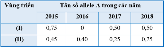 Bảng dưới đây mô tả tần số allele A (của một gene gồm hai allele A và a) hai quần thể cá cùng loài ở hai vùng triều khác nhau tại cùng một vùng biển trong 4 năm liên tiếp nhau. Năm 2016, quần thể ở vùng triều (I) chịu ảnh hưởng của tảo độc nở hoa làm chết hết các cá thể cá ở đây. Cuối năm 2016, một số cá thể cá của quần thể ở vùng triều (II) di cư đến vùng triều (I) làm thay đổi tần số allele A ở hai vùng triều.