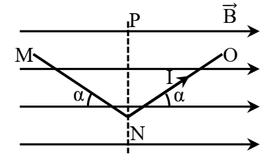 Cho đoạn dây dẫn MO được gấp tại trung điểm N của dây và đặt vào vùng có từ trường đều, có các véctơ cảm ứng từ như hình vẽ. Biết I = 2A, B = 0,01 T, MO = 10 cm; \(\alpha = {30^0}\).