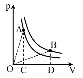 Trong hình vẽ, điểm A và B là hai điểm trạng thái của một lượng khí lí tưởng nhất định trên hai đường đẳng nhiệt. Diện tích của tam giác vuông OCA và ODB lần lượt là \({S_A}\) và \({S_B}\).