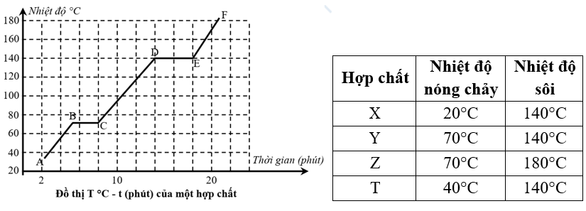 Hình dưới đây là giản đồ mô tả sự tăng nhiệt độ dưới áp suất khí quyển \(\left( {^0C} \right)\) theo thời gian (phút) của một hợp chất dưới áp suất khí quyển.