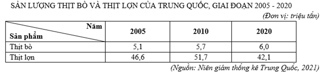 | a) Sản lượng thịt bò và thịt lợn của Trung Quốc tăng liên tục từ năm 2005 đến năm 2020. | ||