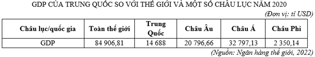 Căn cứ vào bảng số liệu trên, tính tỉ trọng GDP của Trung Quốc so với thế giới (làm tròn kết quả đến hàng đơn vị của %)