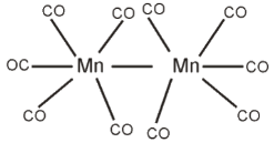 Phức chất [Mn2(CO)10] có cấu tạo như hình bên. Số nguyên tử trung tâm trong phức chất