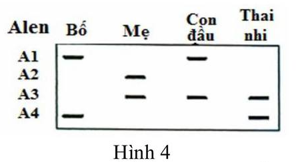 Có khoảng 3% dân số bình thường mang allele đột biến ở gene CFTR gây bệnh xơ nang. Một nhà tư vấn di truyền nghiên cứu một gia đình trong đó có bố và mẹ đều là thể mang về một đột biến CFTR. Họ sinh con đầu lòng bị bệnh này và đang muốn kiểm tra thai để sinh đứa thứ hai xem đó là thay bị bệnh hay thể mang hay hoàn toàn không mang gene bệnh. Các mẫu DNA từ các thành viên trong gia đình và thai nhi được xét nghiệm PCR và điện di trên gel, kết quả như hình 4.
