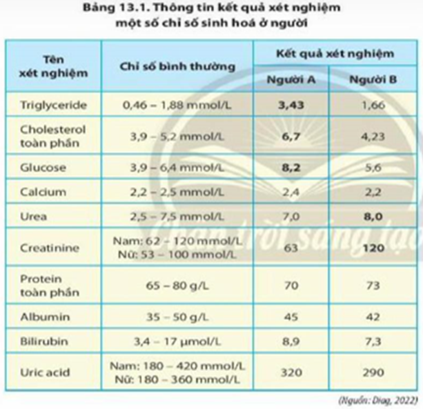 Người A và người B đi kiểm tra sức khỏe và nhận được thông báo về các chỉ số xét nghiệm như bảng 3.