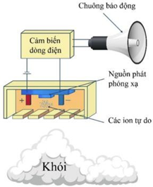 Hình vẽ bên mô tả sơ đồ hoạt động đơn giản hoá của cảm biến báo khói ion hoá. Nguồn