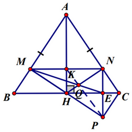 d) Tia AH cắt MN tại \({\rm{K}},{\rm{NP}}\) cắt BC tại \({\rm{E}},{\rm{NH}}\) cắt ME tại Q. Chứng minh: \({\rm{P}},{\rm{Q}},{\rm{K}}\) thẳng hàng.