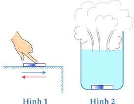 Hình vẽ bên thể hiện hai cách làm thay đổi nội năng của một vật đó là dùng tay cọ xát miếng đồng trên mặt bàn (hình 1) và cho nước sôi vào trong cốc có sẵn miếng đồng ở nhiệt độ phòng (hình 2).