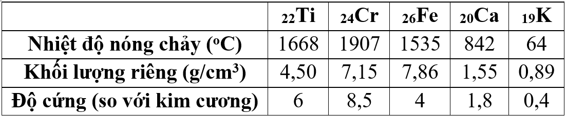 Cho thông số của một số kim loại trong bảng sau:Cho các nhận định sau:(a) Titanium là kim loại