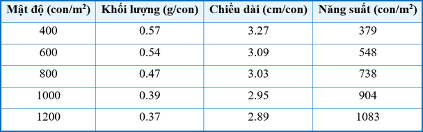 Tại sao với mật độ 400 con/m2 lại cho chỉ tiêu về khối lượng và chiều dài tốt nhất?