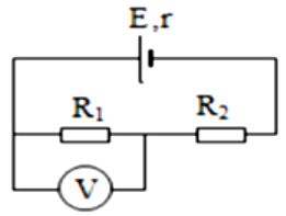 Cho mạch điện như hình bên. Biết \(E = 12V,r = 1\Omega ;{R_1} = 3\Omega ;{R_2} = 6\Omega \) điện trở của vôn kế rất lớn. Bỏ qua điện trở của dây nối. Số chỉ vôn kế là bao nhiêu V?