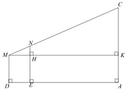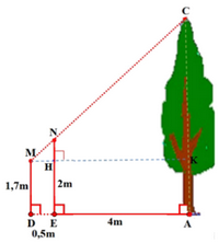 a) Một người đo chiều cao của một cây nhờ một cọc chôn xuống đất, cọc cao 2m và đặt xa cây 4m. Sau khi người ấy lùi ra xa cách cọc 0,5m thì nhìn thấy đầu cọc và đỉnh cây cùng nằm trên một đường thẳng (như hình vẽ). Hỏi cây cao bao nhiêu, biết khoảng cách từ chân đến mắt người ấy là 1,7m