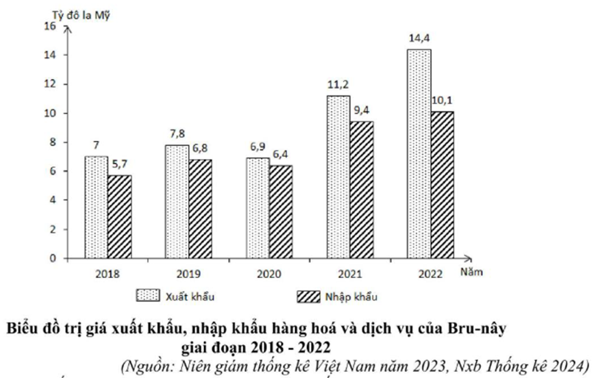 | b) Năm 2019, Bru-nây có giá trị cán cân thương mại nhỏ nhất. |
