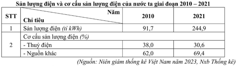 Căn cứ vào bảng số liệu trên, hãy cho biết sản lượng thuỷ điện năm 2021 cao hơn sản lượng thuỷ điện năm 2010 bao nhiêu tỉ kWh? (làm tròn kết quả đến một chữ số thập phân).