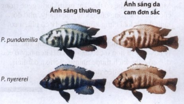 Trong một hồ ở châu Phi, người ta thấy có 2 loài cả rất giống nhau về các đặc điểm hình thái và chỉ khác nhau về màu sắc, một loài màu đỏ và một loài có màu im Mặc dù cùng sống trong một hồ nhưng chúng không giao phối với nhau. Tuy nhiên, khi các nhà khoa học nuôi các cá thể của 2 loài này trong một bể cá có chiếu ánh sáng đơn sắc làm chúng trông cùng màu thì các cá thể của 2 loài lại giao phối với nhau và sinh con hữu thụ. Người ta cho rằng 2 loài này được tiến hoá từ một loài ban đầu.