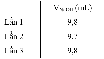 Để xác định hàm lượng của acetic acid trong một loại giấm ăn, một học sinh pha loãng loại giấm ăn đó 10 lần rồi tiến hành chuẩn độ 10 mL giấm ăn sau pha loãng bằng dung dịch NaOH 0,1 M, thu được kết quả như bảng sau: