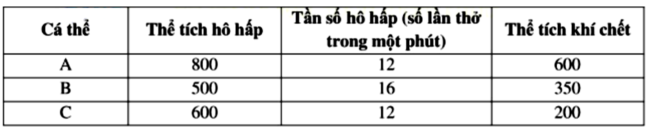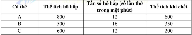 Hãy quan sát bảng dưới đây về đặc điểm hô hấp giả định của 3 cá thể A, B và C.