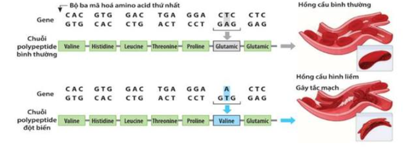 Hình bên mô tả trình tự bộ ba mã hóa gene và trình tự amino acid của hồng cầu bình thường và hồng cầu hình liềm (bị đột biến).