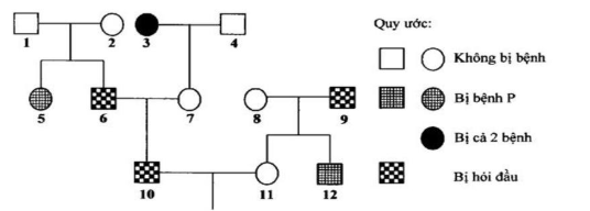 Biết rằng hai cặp gene quy định hai tính trạng nói trên nằm trên NST thường và phân li độc lập với nhau. Bệnh hói đầu do allele trội H quy định, kiểu gene dị hợp Hh biểu hiện bệnh hói đầu ở nam và không hói đầu ở nữ, quần thể này ở trạng thái cân bằng di truyền và có tỉ lệ người bị hói đầu là 40%. Xác suất để cặp vợ chồng số (10) và (11) sinh ra một đứa con trai không hói đầu và không bị bệnh P là bao nhiêu (tính làm tròn đến 2 chữ số sau dấu phẩy)?