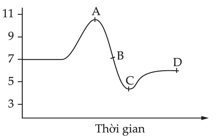 Một cảm biến được nối với một bộ xử lí dữ liệu. Giá trị cảm biến đo được được hiển thị giá trị tức thời và vẽ đồ thì biến thiên theo thời gian như trong hình. Ta đọc giá trị đo tại thời điểm nào?
