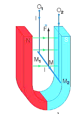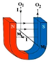 Một đoạn dây dẫn \({M_1}{M_2}\) được treo nằm ngang giữa 2 cực của nam châm chữ U bởi hai dây mảnh nhẹ không dãn OM, và \({O_2}{M_2}\) sao cho \({M_1}{M_2}\) vuông góc với các đường sức từ của từ trường giữa 2 cực của nam châm như hình vẽ bên. Cho dòng điện cường độ I cuộn qua dây theo chiều từ \({M_1}\) đến \({M_2}\) thì lực từ tác dụng lên đoạn dây có: