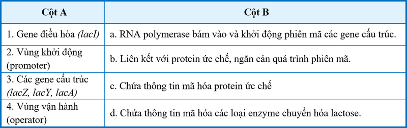 Ghép cột A với cột B sao cho phù hợp với mô tả về cơ chế điều hoà biểu hiện gene của operon lac ở vi khuẩn E. coli.