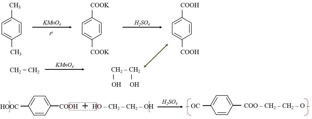 Nhựa PET là một loại polyester được ứng dụng rộng rãi làm chai nhựa, hộp đựng, tơ sợi,… PET được tổng hợp từ phản ứng ester hóa giữa acid X và alcohol Y. Biết X được điều chế bằng quá trình oxi hóa p-xylene với thuốc tím (KMnO4) đun nóng, sau đó acid hóa sản phẩm bằng sulfuric acid loãng. Còn alcohol Y được điều chế bằng quá trình oxi hóa ethylene với thuốc tím ở điều kiện thường. Xác định công thức cấu tạo của PET.