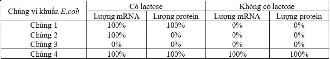 Bảng 1 mô tả hàm lượng mRNA và protein tương đối của gene LacZ thuộc operon Lac ở các chủng vi khuẩn E.coli trong môi trường có hoặc không có lactose. Biết rằng chủng 1 là chủng bình thường, các chủng 2, 3, 4 là các chủng đột biến phát sinh từ chủng 1, mỗi chủng bị đột biến ở một vị trí duy nhất trong operon Lac.